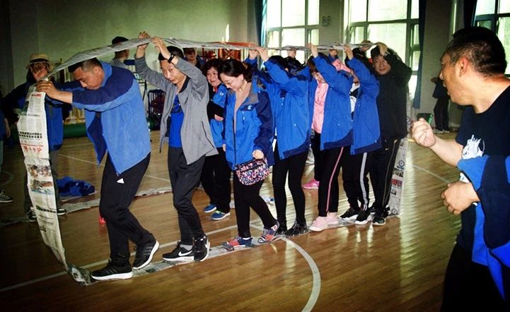每個隊用提供的材料將報紙圍成一個可以行進(jìn)的履帶式的環(huán),要求本組所有成員在規(guī)則要求下走完規(guī)定的路程,以最快到達(dá)終點的組為優(yōu)勝。